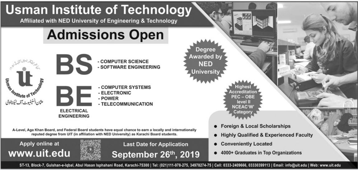 Usman Institute of Technology Karachi has offered admission for BS in Computer science, Software Engineering, BE in Computer systems, Power, Electronic, Telecommunication. Scholarships are available. Last date of submission of admission application 26 Sep 2019.