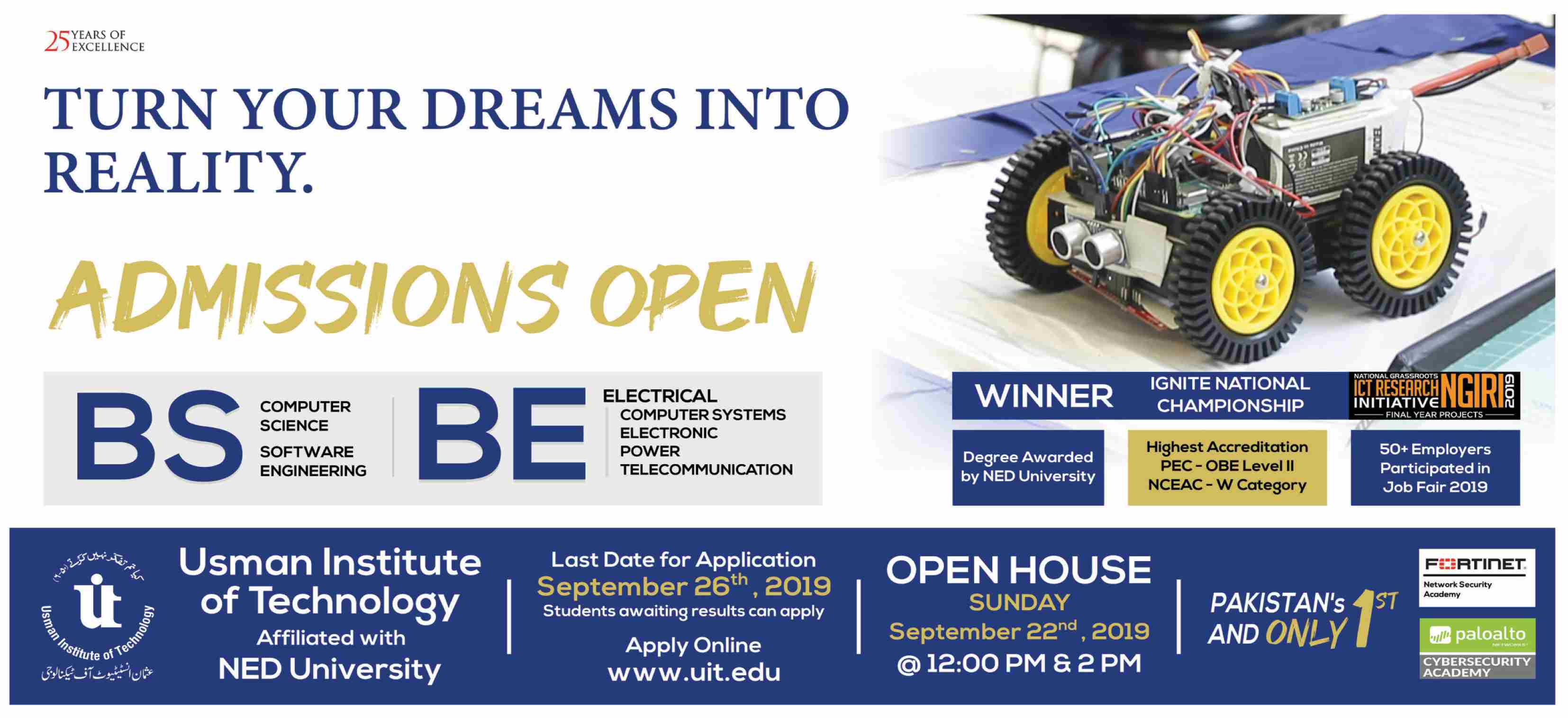 Usman Institute of Technology Karachi has offered admissions for BS in Computer science, Information Technology, BE in Electrical Engineering, Power Engineering, Electronic Engineering, Telecommunication Engineering, Computer systems. Last date for application 26 Sep 2019.