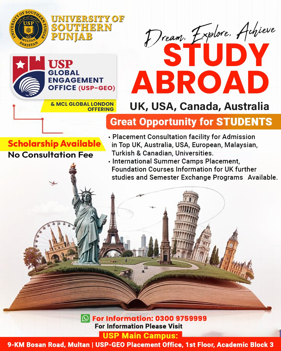 Students interested in applying are encouraged to contact the USP Main Campus Multan or visit the USP-GEO Placement Office to begin their journey. With expert counseling, structured guidance, and international exposure opportunities, the Study Abroad Opportunity 2026 at UNIVERSITY OF SOUTHERN PUNJAB stands out as a major step toward global academic success.