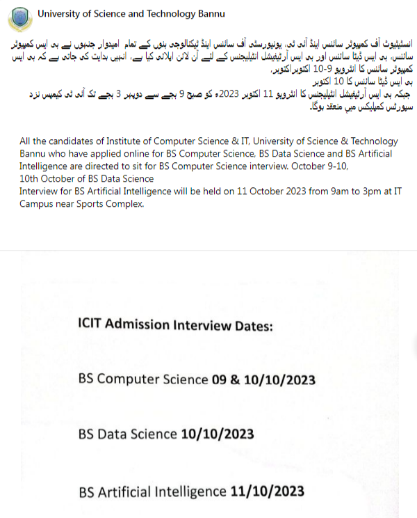 - BS Data Science Interview October 10, 2023: Candidates applying for BS Data Science will undergo their interviews on October 10th, 2023. Data Science is a rapidly growing field with vast opportunities, and UST Bannu is excited to welcome students who are eager to explore this dynamic discipline.