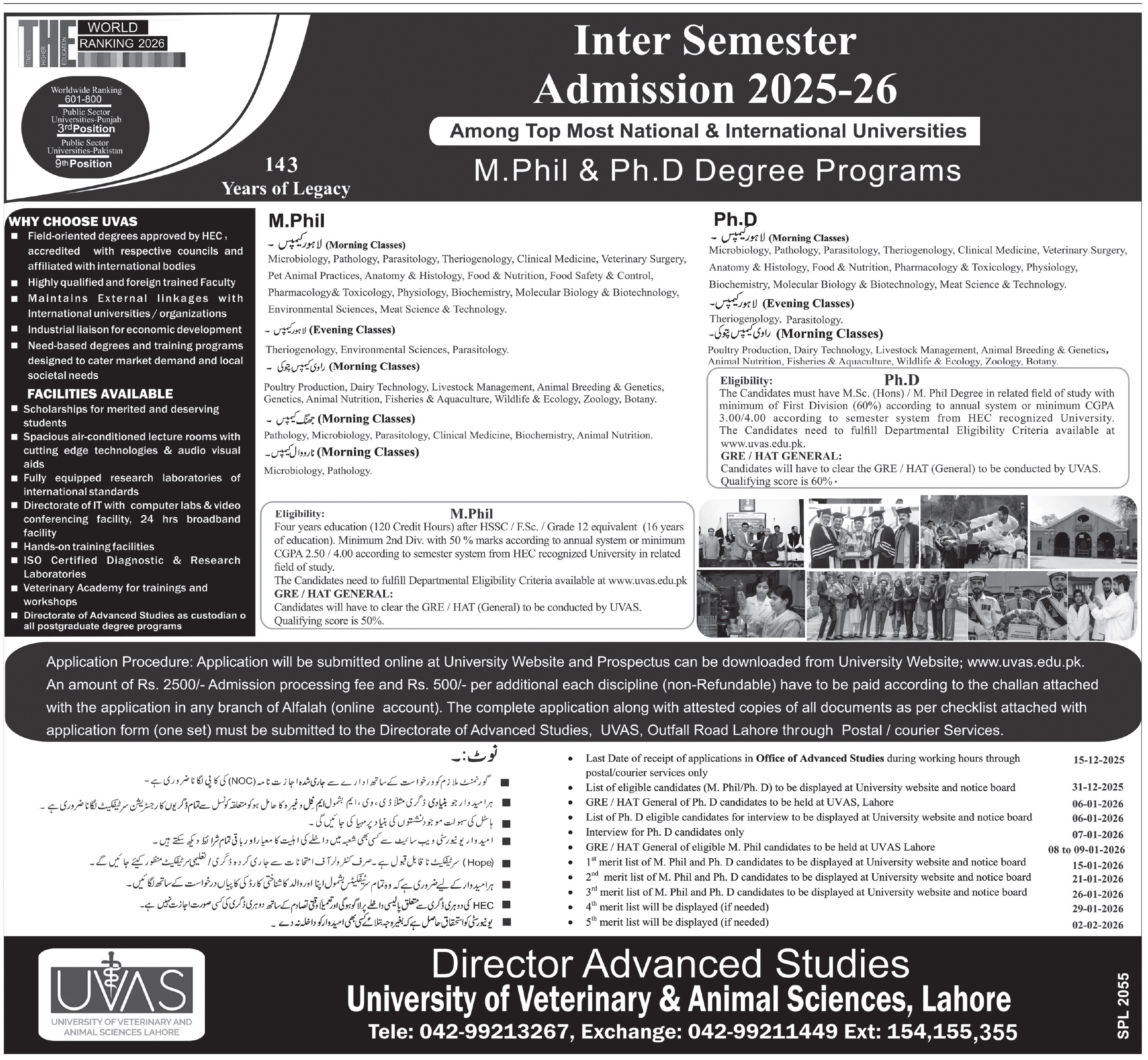 The University of Veterinary and Animal Sciences UVAS Lahore, one of Pakistan’s oldest and highest-ranked public sector universities, has announced Inter-Semester Admissions 2025–26 for its M.Phil and Ph.D degree programs across all campuses.