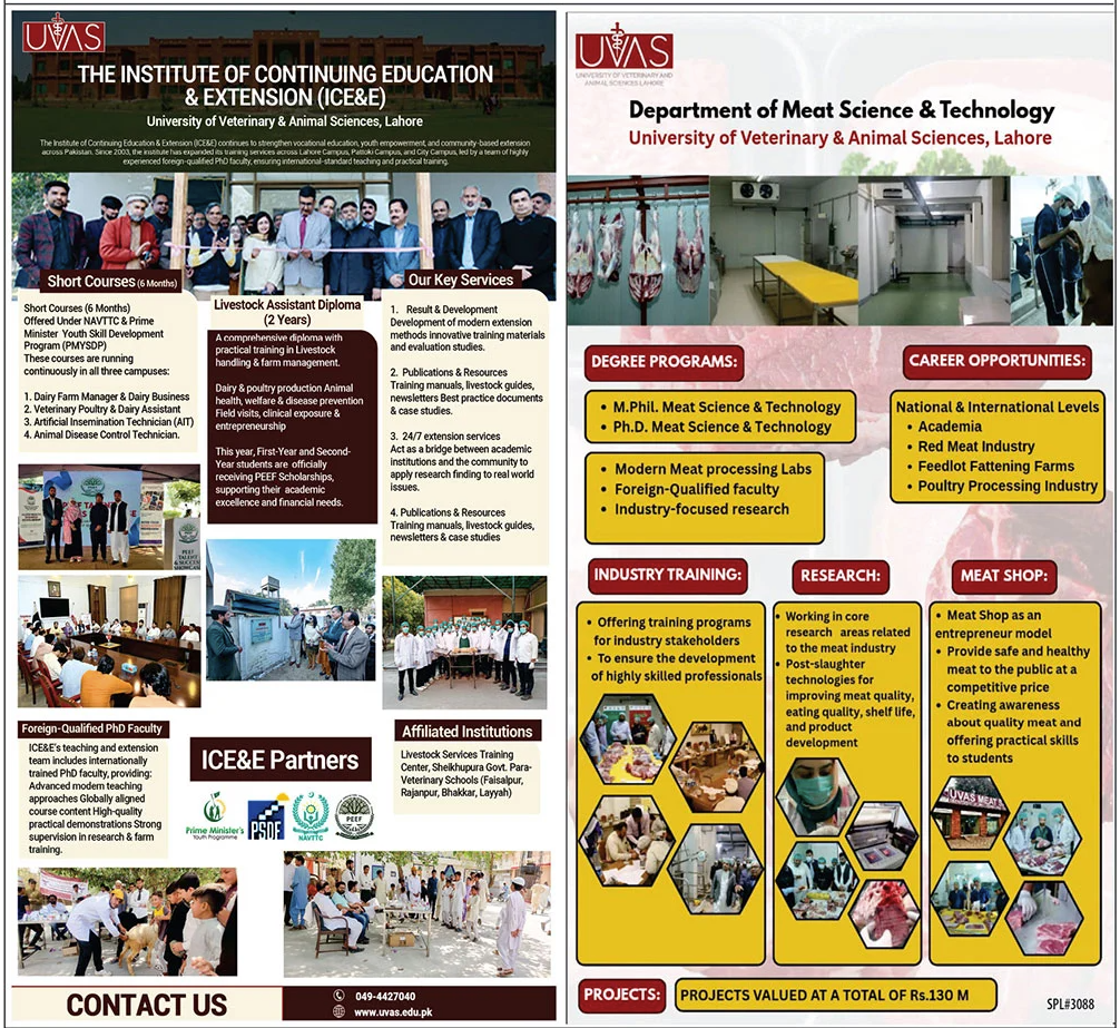The Institute of Continuing Education & Extension ICE&E at the University of Veterinary & Animal Sciences UVAS, Lahore, is committed to strengthening vocational education, youth empowerment, and community-based extension services across Pakistan. Established in 2003, ICE&E has expanded its training programs across Lahore Campus, Pattoki Campus, and City Campus, offering international-standard teaching and practical training through a team of highly experienced, foreign-qualified PhD faculty.
