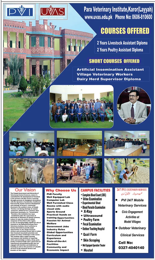 The Para Veterinary Institute PVI, Karor Layyah, under the University of Veterinary & Animal Sciences UVAS, is now accepting applications for its diploma and short courses. PVI is committed to training skilled professionals in animal health, livestock management, and veterinary services, empowering students for careers in government, industry, and global veterinary opportunities.