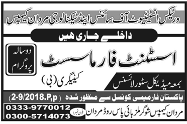 Vertex Institute of Science & Technology Mardan has announced admissions for Assistant Pharmacist Category B. Duration of course will be 2 years. Medical Store Licence will be given.