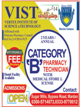 Vertex Institute of Science & Technology VIST is seeking applications for admissions 2020 in 2 year Pharmacy Technician Course B Category in Mardan, KPK.