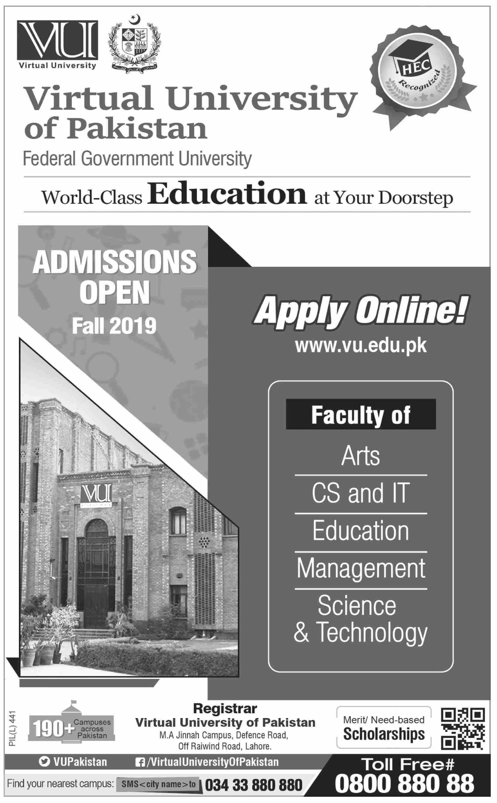 Virtual University Lahore has offered admission in faculties of Arts, Computer science & Technology, Education, Management, Science & Technology. Scholarships are available for merit & need based students.