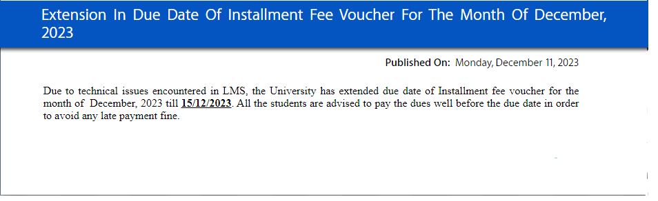 In a move to enhance accessibility and accommodate unforeseen technical glitches, Virtual University VU has extended the due date for installment fee vouchers for December 2023. This extension, prompted by technical issues within the VU Learning Management System LMS, reflects VUs commitment to ensuring a seamless learning experience for its students.