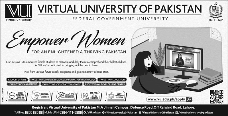 Virtual University of Pakistan has advertised admission for the year 2022 to Empower Women. Virtual University of Pakistan is offering admission for female to Empower Women in the Fields of Arts, Education, Management, Science and Technology, Development Center, Computer Science and Information Technology. This is the golden opportunity for female student. The student who want to take admission in these programs can visit the appropriate branch for or visit University website further information as soon as feasible, submit a form before the admission closes.