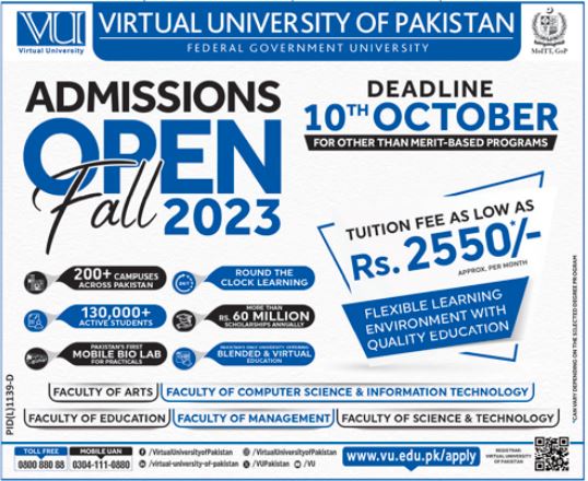 Virtual University of Pakistan is more than an educational institution; its a gateway to quality education, personal development, and an array of opportunities. As the Fall 2023 admissions open, take advantage of this remarkable chance to pursue your academic dreams with a university that truly cares about your success. Remember, the opportunities are limitless, and the choice is yours.