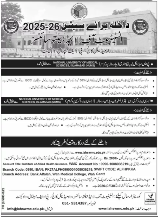 The Institute of Allied Health Sciences IAHS at Wah Medical College has officially opened its doors for the academic session 2025-26. This announcement serves as a significant opportunity for students aiming to build a career in medical laboratory technology and blood transfusion medicine within a prestigious environment affiliated with the National University of Medical Sciences NUMS, Islamabad.
