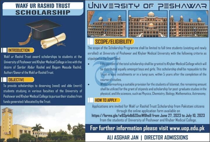 Wakf ur Rashid Trust is offering scholarships to deserving and meritorious students at the University of Peshawar and Khyber Medical College, in accordance with the wishes of Sardar Abdur Rashid and Begum Masuda Rashid. The trust aims to support students financially by providing scholarships generated from allocated funds. The students can seek information of Wakf ur Rashid Trust Scholarships at University of Peshawar & KMC