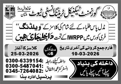 Operated under the Technical Education & Vocational Training Authority TEVTA Punjab, the Government Technical Training Institute GTTI Multan remains a cornerstone for skill development. The current intake focuses on the Welding trade, providing students with hands-on experience in a critical industrial sector. This initiative is particularly significant as it falls under the Integrated Welfare and Rehabilitation Program IWRPP, ensuring that the training is provided as a free course to eligible candidates.