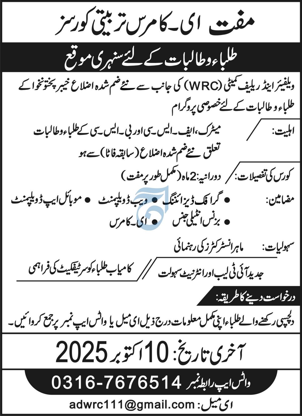 The Welfare and Relief Committee WRC is pleased to announce admissions 2025 for a free two-month e-commerce training program for male and female students belonging to the newly merged districts formerly FATA of Khyber Pakhtunkhwa.