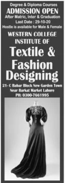 Western College Institute of Textile & Fashion Designing invites the application forms of admissions 2020 for Intermediate and Graduation programs in Lahore.