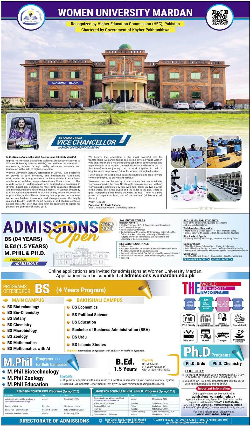 Interested candidates are encouraged to WUM apply online at admissions.wumardan.edu.pk to secure their future.