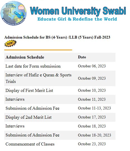 In the picturesque region of Swabi, Khyber Pakhtunkhwa, a beacon of hope and opportunity shines brightly for aspiring female scholars. The Women University Swabi WUS continues to open doors for young women, equipping them with the knowledge, skills, and confidence needed to make their mark on the world. As the institution gears up for its Fall 2023 admissions, heres a closer look at the admission schedule and what prospective students can expect.
