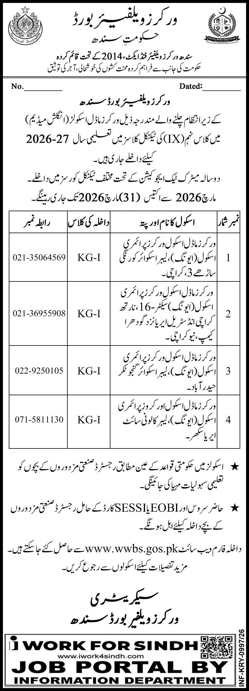 The Workers Welfare Board Sindh has officially opened admissions for technical education at the secondary level for the upcoming academic year. Under the Sindh Workers Welfare Fund Act 2014, the board is inviting applications for Class IX technical streams across various Workers Model Schools in the province. This initiative is designed to provide the children of registered industrial workers with high-quality, English-medium technical education, bridging the gap between traditional schooling and vocational expertise.
