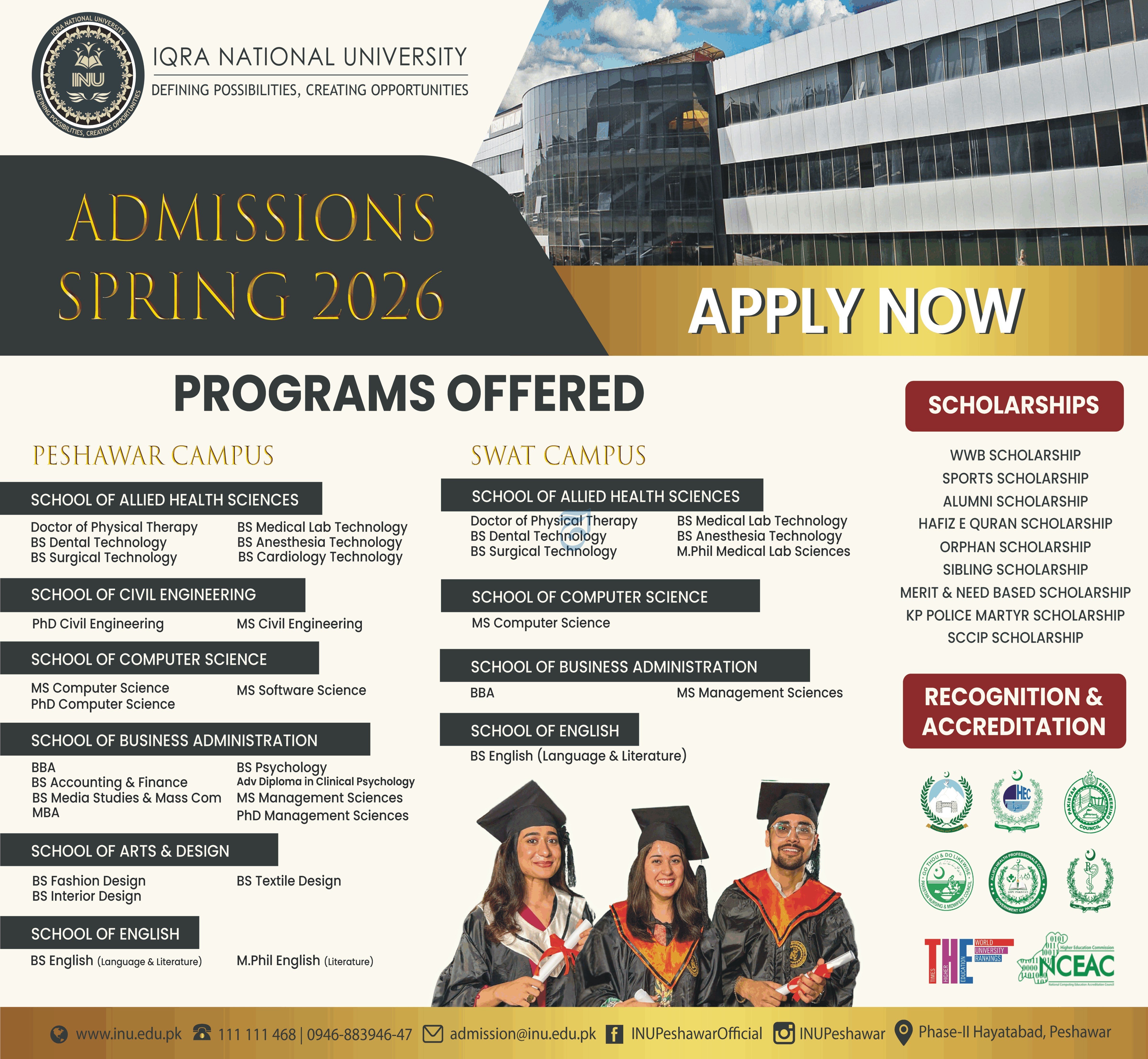 Iqra National University INU has officially announced the commencement of INU Admissions 2026 for the Spring semester. With a reputation for "Defining Possibilities and Creating Opportunities," the university is inviting applications across a diverse range of disciplines at both its Peshawar and Swat campuses.