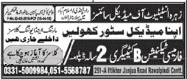 Zohra Institute of Medical Sciences has advertised admission for the year 2023. Zohra Institute of Medical Sciences is offering admission in two Years Diploma Course of Pharmacy Technician Catagory B. Those students who want to take admission in Diploma Course of Pharm B Year 2023 must visit Zohra Institute of Medical Sciences official site as soon as possible before the admission date closed. This institution has well qualified staff and offer the highest level of education.